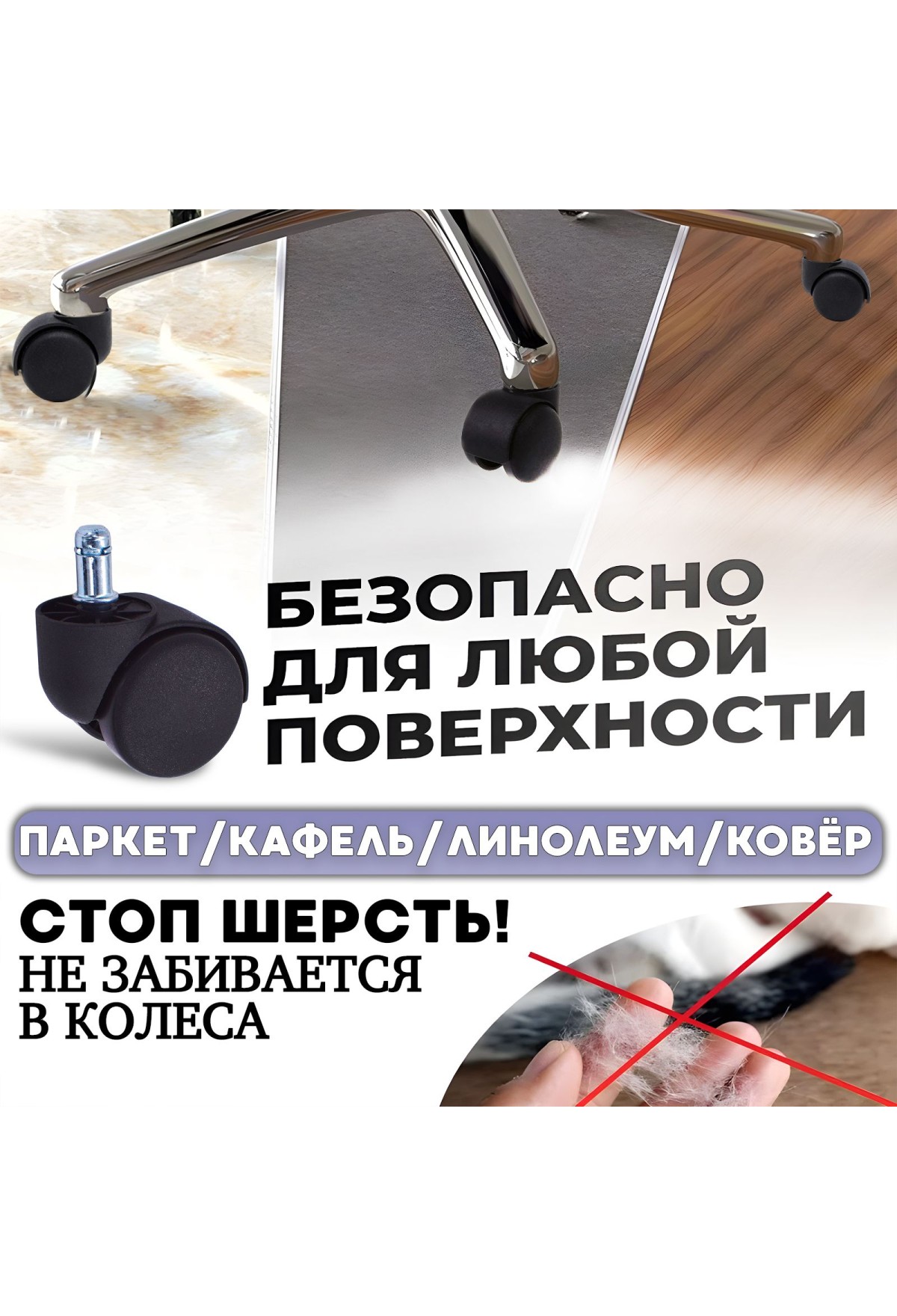 Комплект роликов подойдут для офисных, компьютерных и игровых кресел. Обеспечивают бесшумное передвижение кресла, не царапает паркет, ламинат, ковролин, кафель и безопасно для других поверхностей, защищает пол от повреждений. Долговечны, отсутствует запах и не оставляет следов на полу. У колес для кресла прочные материалы.