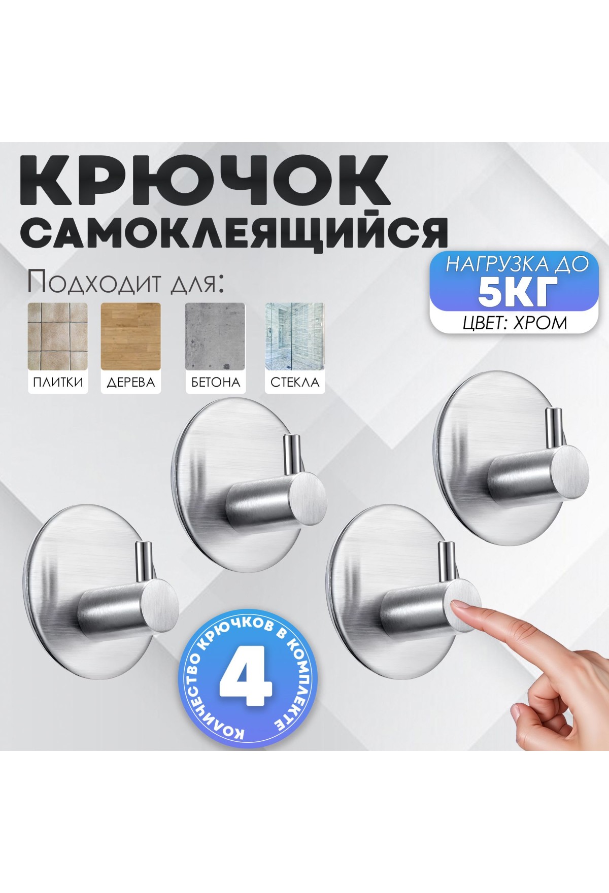 Крючки самоклеящиеся для ванной и кухни, серебристые 4 шт
