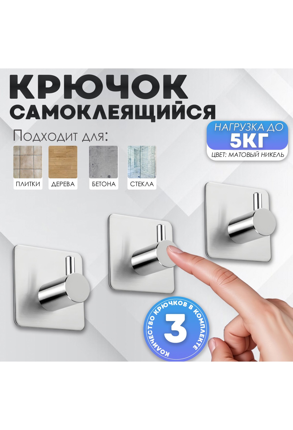 Крючки самоклеящиеся металлические для ванной и кухни, серебристые 3 шт