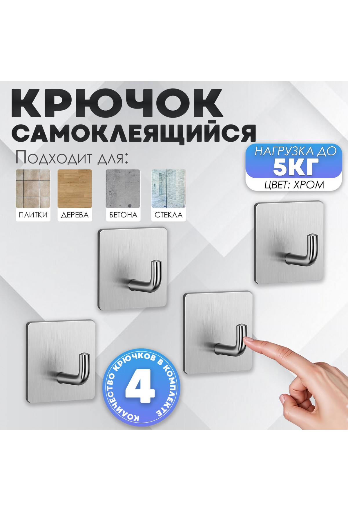 Крючки самоклеющиеся для ванной и кухни, серебристые 4 шт Крючок самоклеящийся металлический настенный