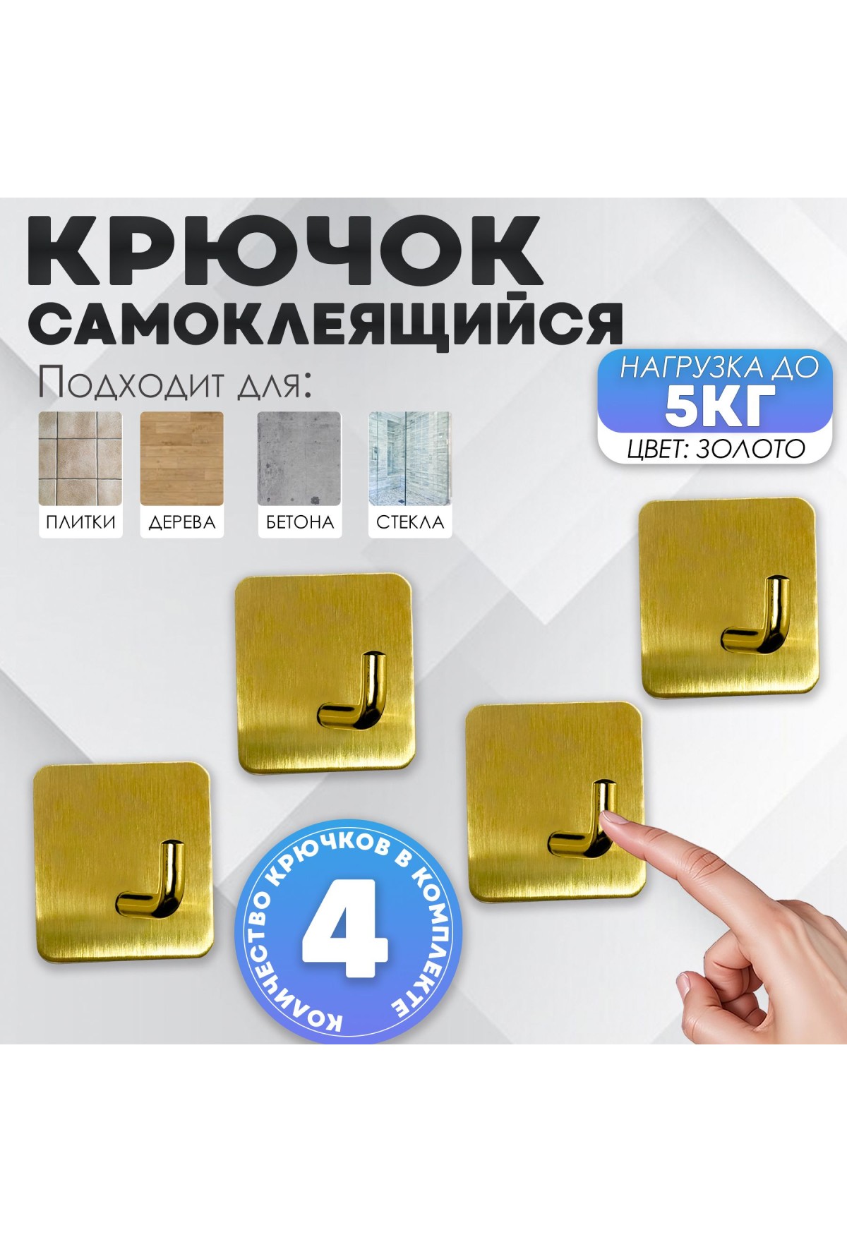 Крючки самоклеющиеся для ванной и кухни, золотые 4 шт Крючок самоклеящийся металлический настенный