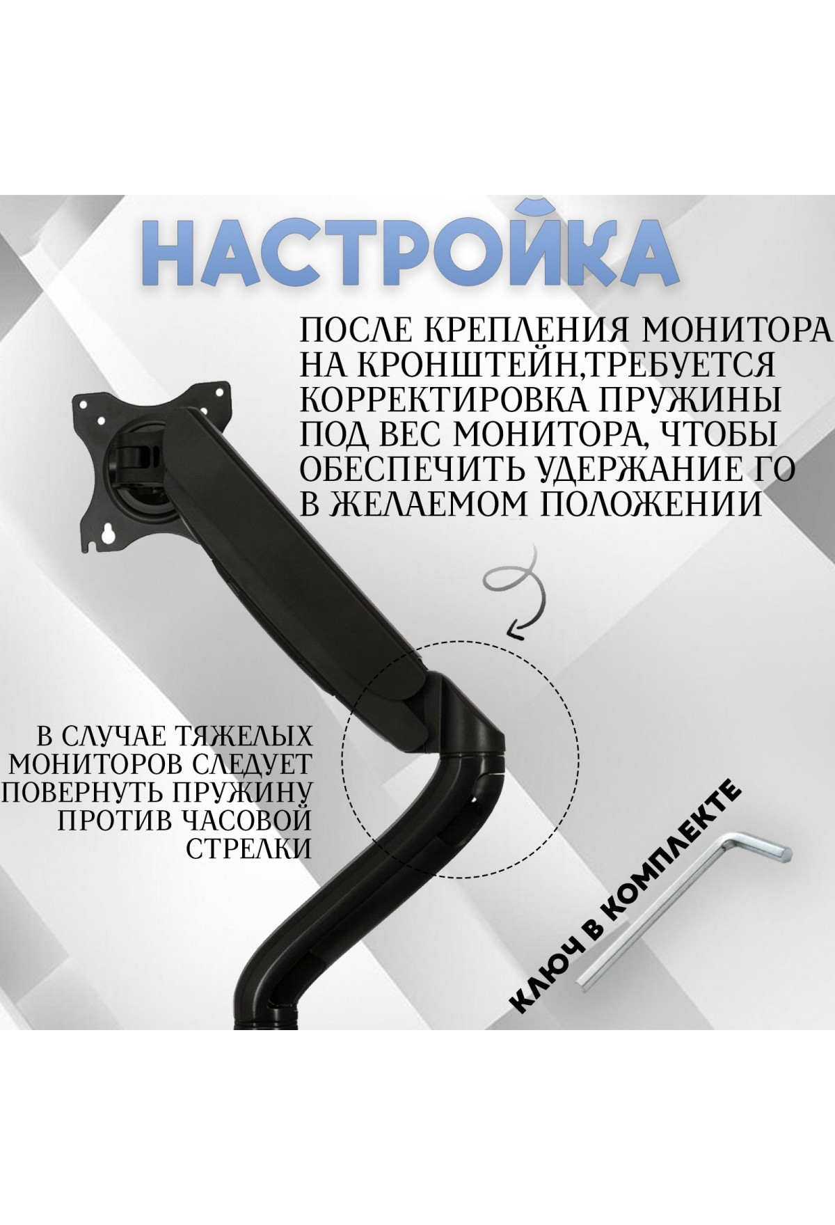 Высокая нагрузочная способность: Кронштейн разработан с учетом максимальной нагрузки до 10 кг, что обеспечивает надежную и безопасную поддержку для большинства современных мониторов. Независимо от размера и типа вашего монитора, вы можете быть уверены, что он будет прочно закреплен и не покажет признаков деформации со временем.