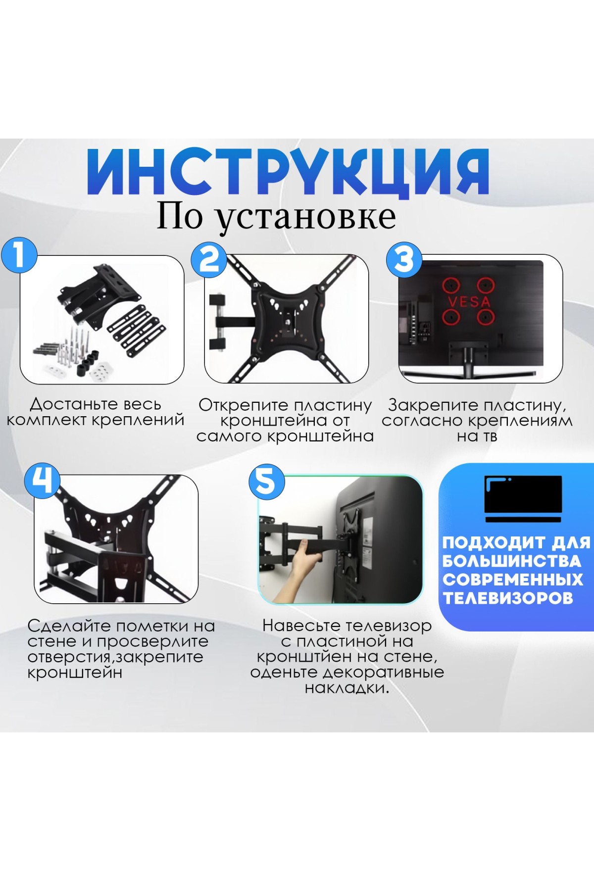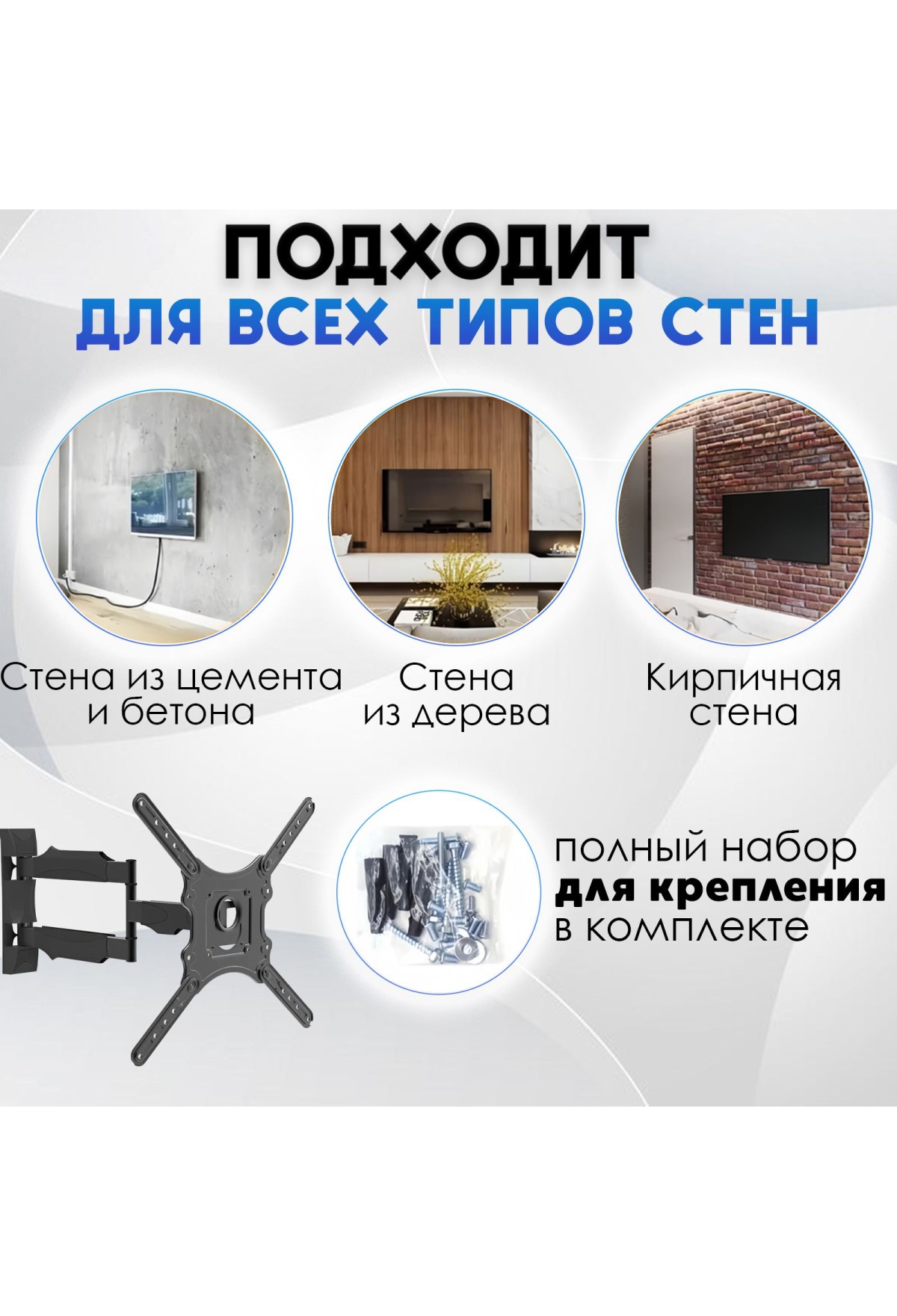 Этот кронштейн премиум класса - незаменимый держатель для вашего телевизора, крепление которого возможно установить на любую стенку в вашем доме или офисе. С его помощью вы сможете повернуть и наклонить телевизор в любом направлении, настроив его под углом, который идеально подходит для вашего комфорта и просмотра.