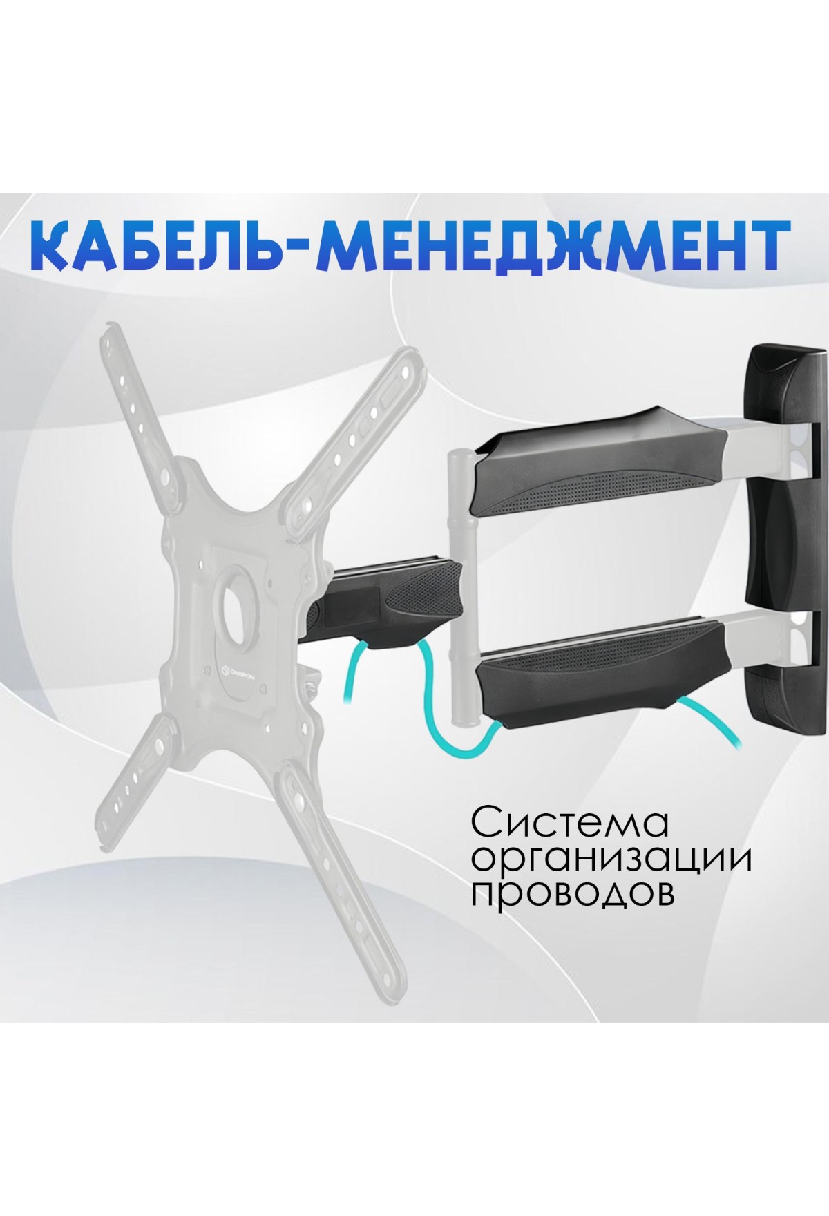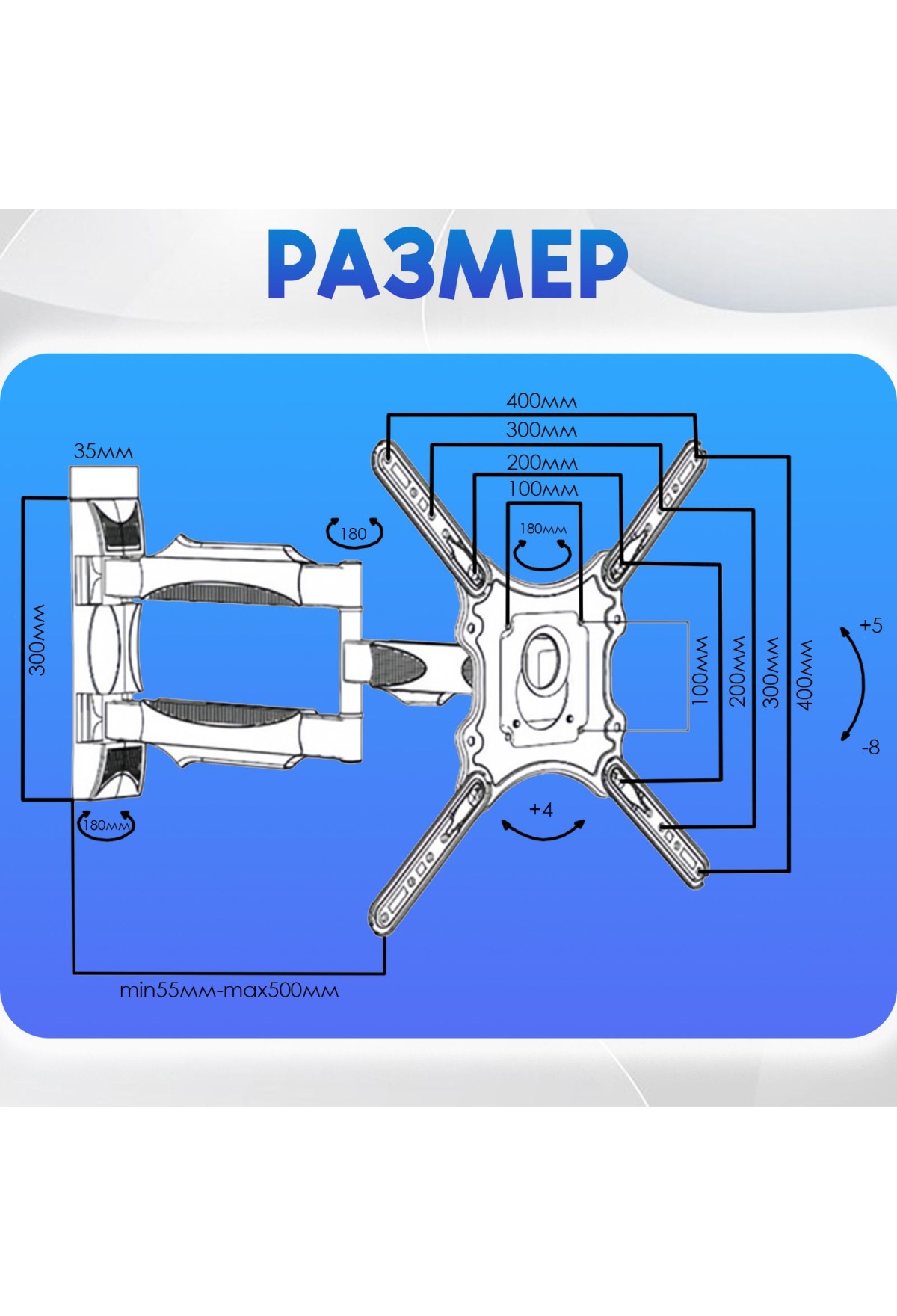 Предусмотрена возможность регулировки расстояния между стеной и зафиксированным на кронштейне телевизором в пределах 55-500 мм.