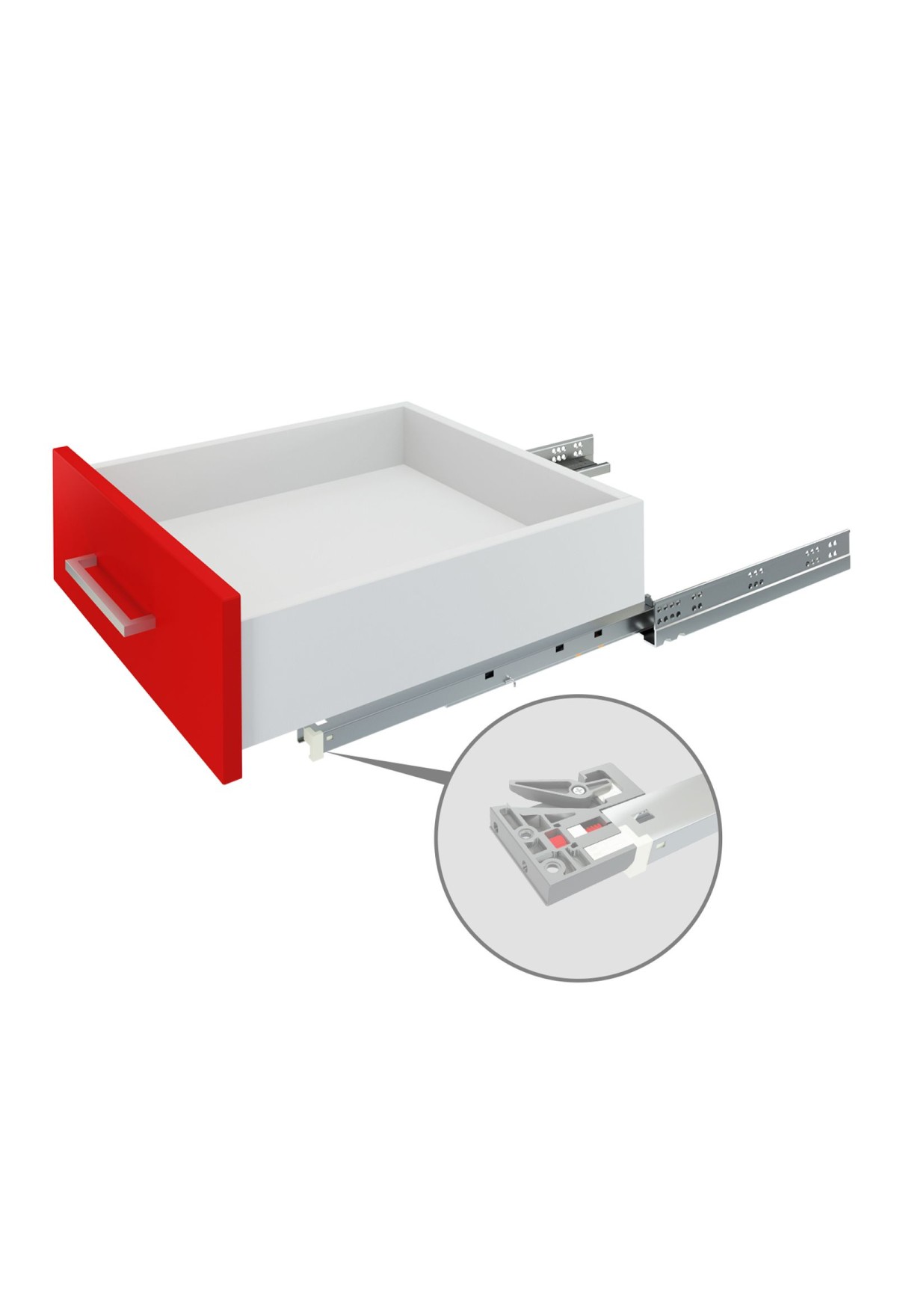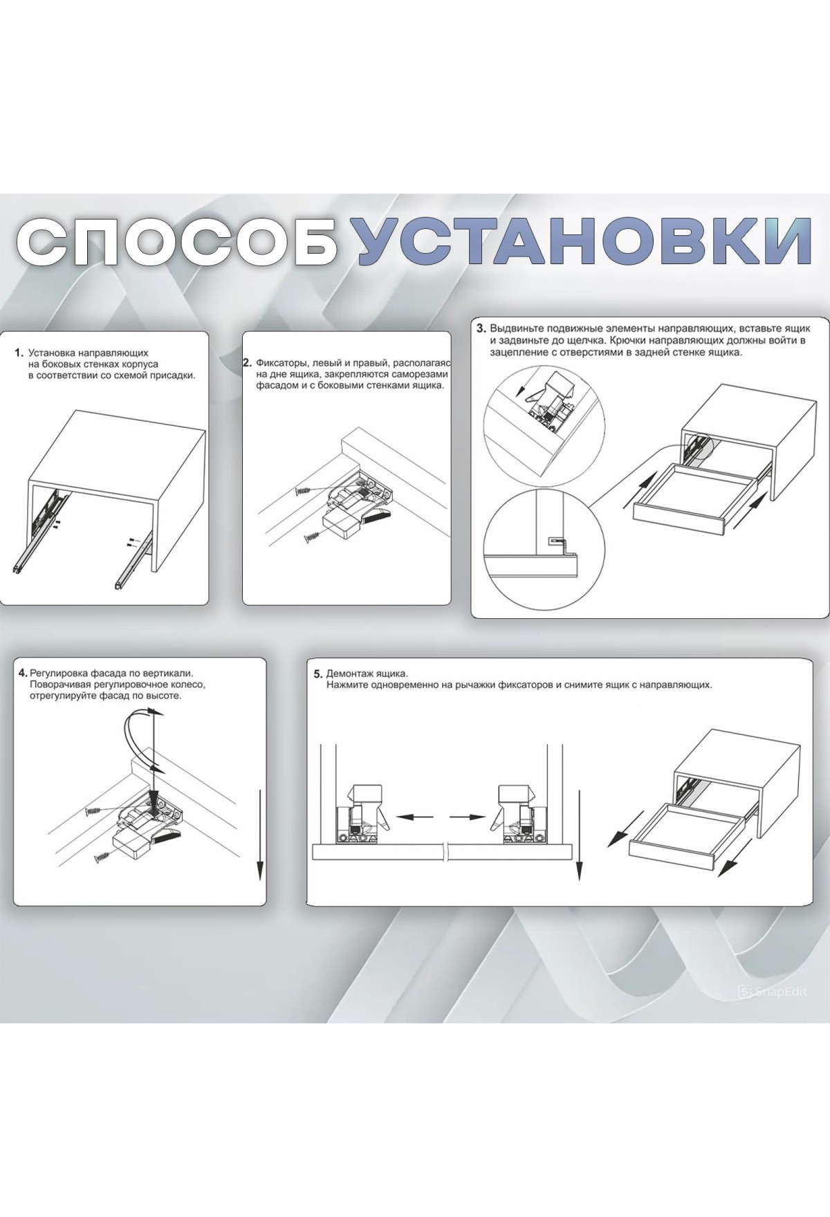 Шариковые направляющие с доводчиком обеспечивают плавное и бесшумное выдвижение ящиков, придавая вашим мебельным изделиям элегантность и функциональность. За счет скрытого монтажа, эти уникальные направляющие не только максимально интегрируются в дизайн, но и обеспечивают полный выдвиг ящиков.