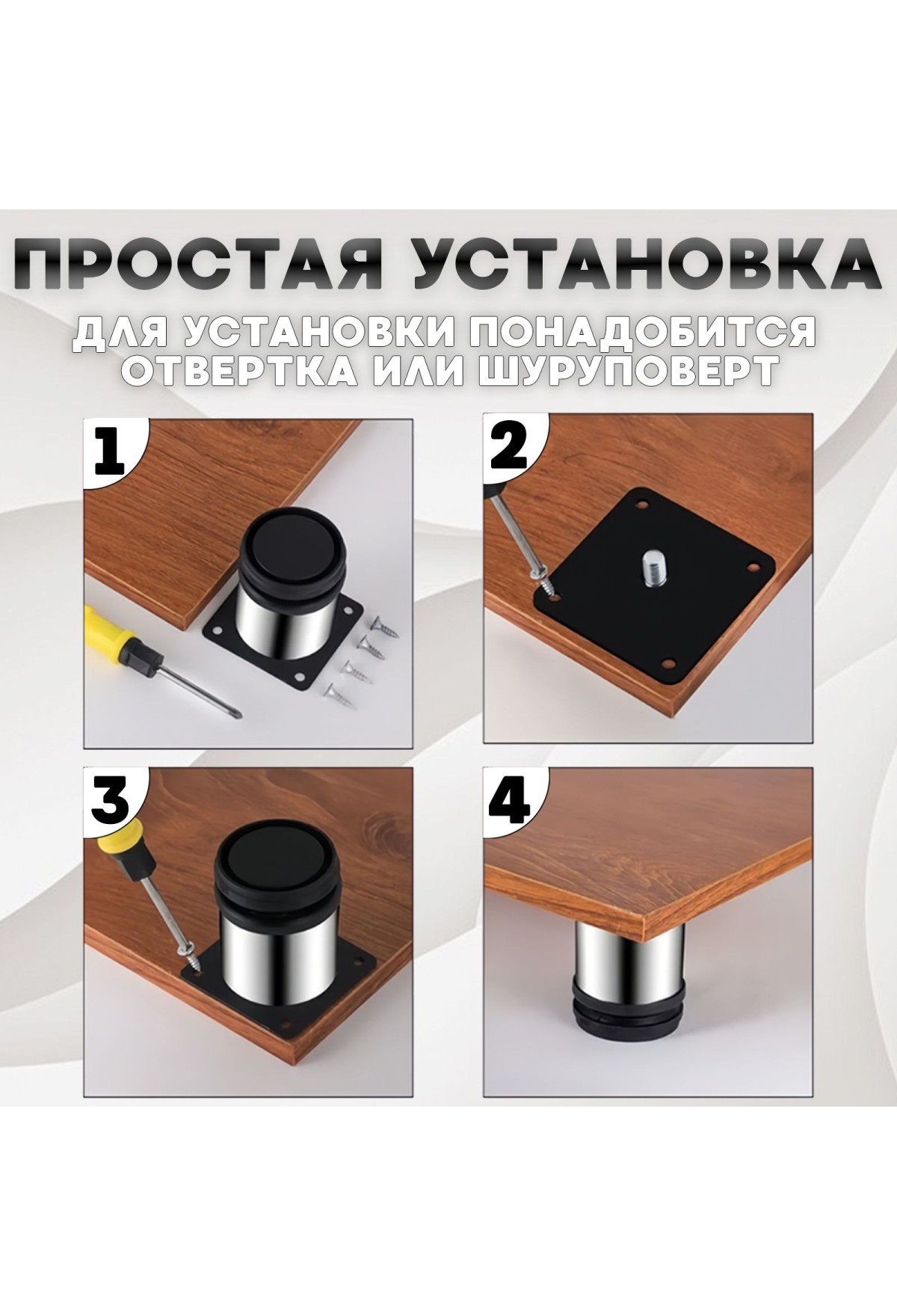 Мебельная опора преобразит вашу мебель на кухне, в спальне, гостиной и детской. Хромированные ножки диаметром 50 мм и высотой 12 см легко устанавливаются самостоятельно. Саморезы входят в комплект! Легкие и изящные опоры для мебели, очень прочные и способны выдержать любой шкаф. Ножка для комода и стеллажа имеет цилиндрическую форму, можно использовать для различной мебели. Мебельные ножки для тумбы и пуфика выдерживают нагрузку до 250 кг. Наша мебельная фурнитура упакована в индивидуальную коробку, что позволяет доставить товар в целостном виде, без царапин. Металлическая ножка для тумбочки универсальная имеет регулировку до +2 см. В комплекте 4 опоры на мебель и крепеж.