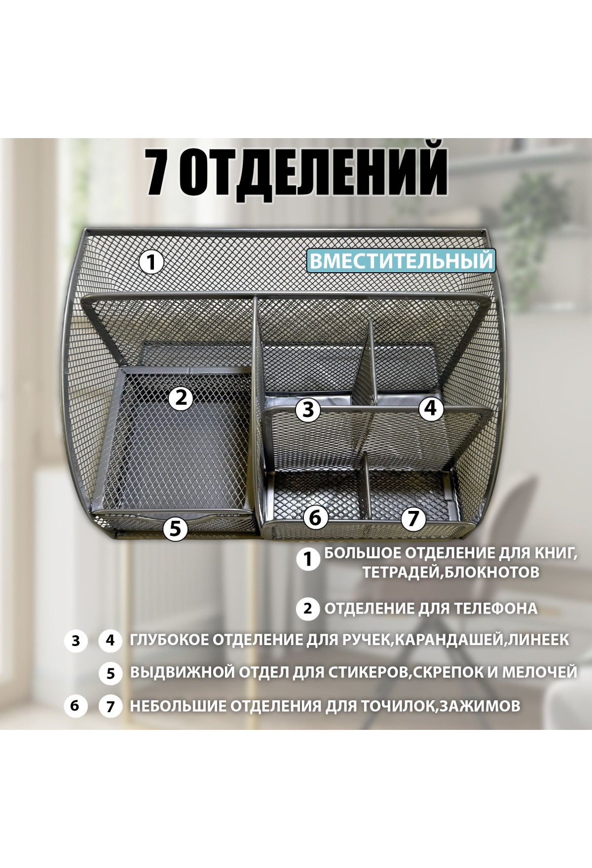 Органайзер для канцелярских принадлежностей с семью удобными ячейками – идеальное решение для организации рабочего пространства. Изготовлен из прочного металла, он прослужит вам долгие годы, не теряя своей надежности. Размеры подставки для канцелярии – 22х13х14 см, что позволяет разместить на ней все необходимые канцелярские мелочи, сохраняя порядок на вашем столе.