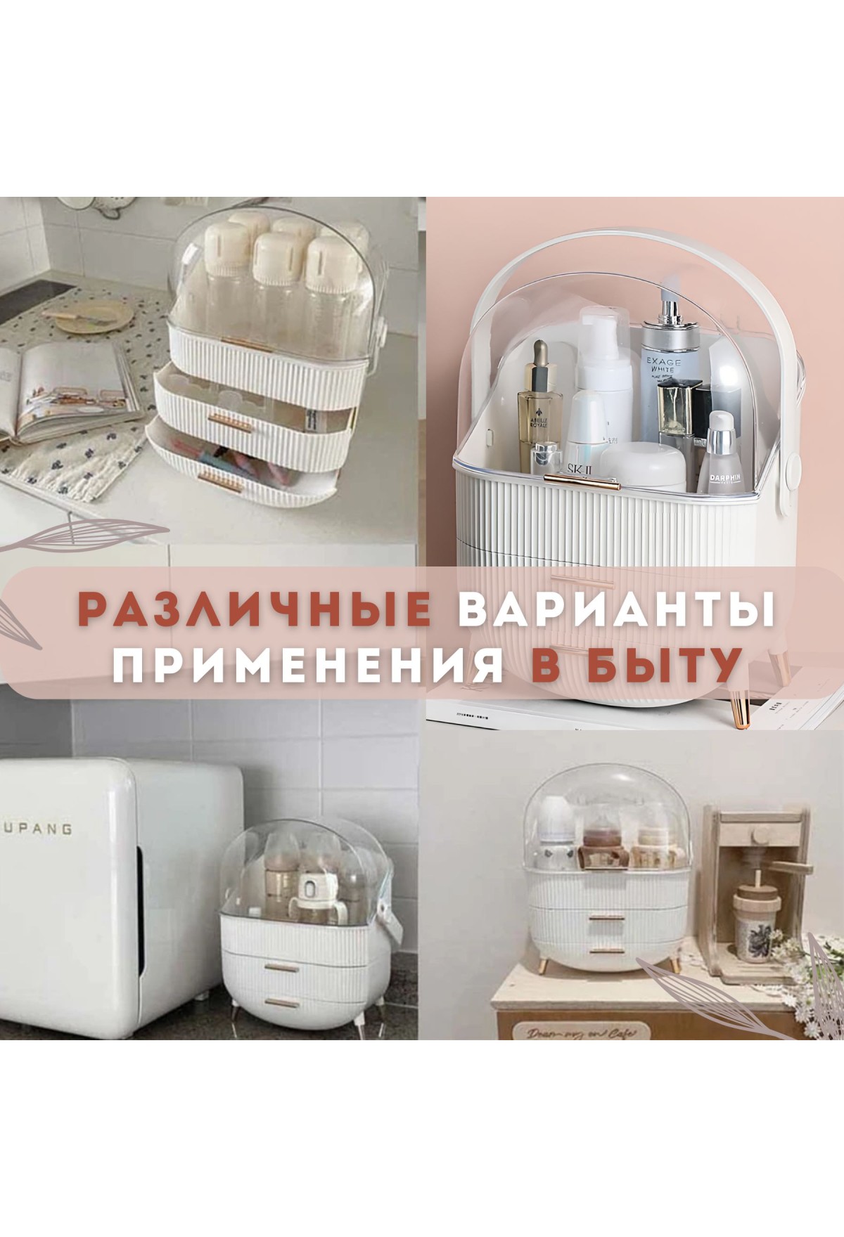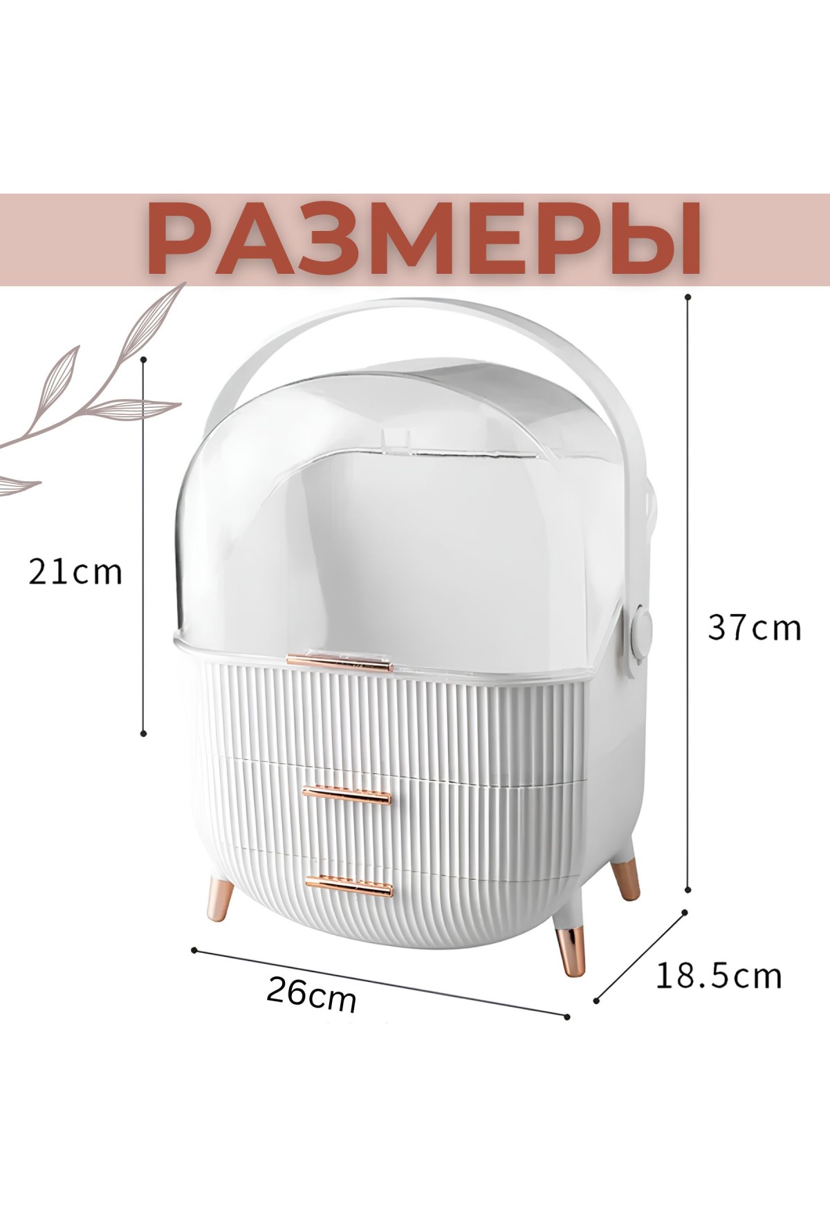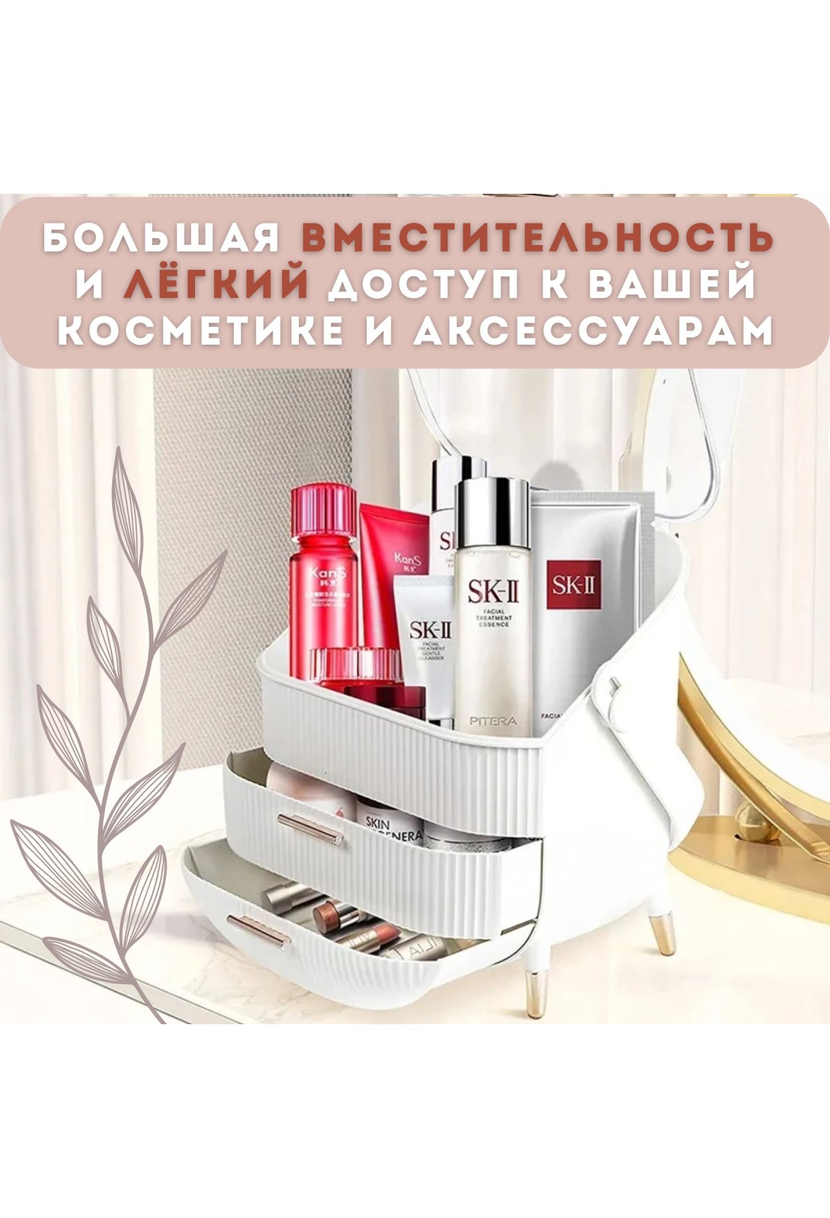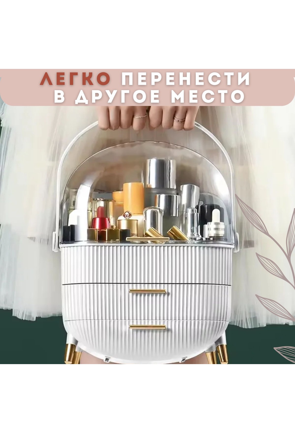 Органайзер для косметики и мелочей - находка для любой девушки и женщины. Взгляды подруг будут прикованы к нему: вместимость и изящество никого не оставляет равнодушным. Большой, но не громоздкий, органайзер идеально поместится на полке у зеркала, на тумбочке у кровати, на комоде или в ванной. Белый с лаконичными золотыми элементами - прекрасное решение для любого интерьера. А главное - вместимость и удобство использования. Органайзер пластиковый косметический имеет три отделения: верхний отсек с откидной крышкой и два выдвижных ящика. Верхний отдел можно выделить для кремов, под высокие флаконы, духи и парфюмерию. Откидной купол прозрачный, у вас всегда в обзоре нужные принадлежности. В среднем и нижнем ящичке удобно хранить уходовую косметику: палетки, карандаши, помады, маленькие бутылочки, канцелярию, маникюрные инструменты мастера, кисти для макияжа, резинки и заколки. Можно использовать для хранения украшений, бижутерии и аксессуаров, набора для маникюра, кисточек, для ватных ушных палочек и ватных дисков, подходит для визажиста. Контейнер для косметики закрытый пыле и влагонепроницаемый, что избавляет от частого ухода за косметикой, а также позволяет хранить в ванной комнате. Если вы давно в поисках коробки, тары или подставки для косметики - наш универсальный бьюти-бокс отлично справится с задачей. Наш кейс для косметики - это не только красивая организация пространства, а нечто большее. Разгрузите ящик комодика, полочки или тумбочки, освободите место на столе, переместив все в красивый бьюти - бокс. Контейнер для мелочей с прозрачной крышкой - не только экономия места, но и эстетичная изюминка интерьера. Первое, что будут спрашивать все - где взять такой же. Органайзер для косметики прозрачный настольный с выдвижными ящиками - идеальный подарок на 8 марта женщине, маме, подруге, коллеге, учителю, девочке подростку, любимой, девушке, воспитателю, дочке, сестре, жене, бабушке. На день рождения, юбилей, годовщину. Ни одна женщина не останется равнодушной.