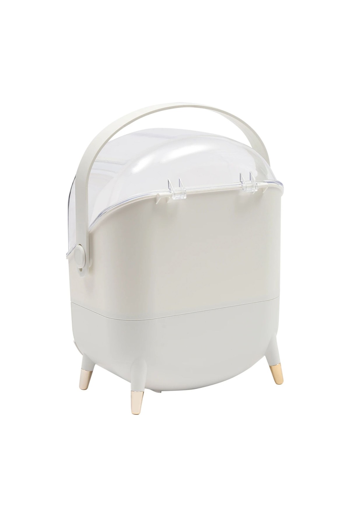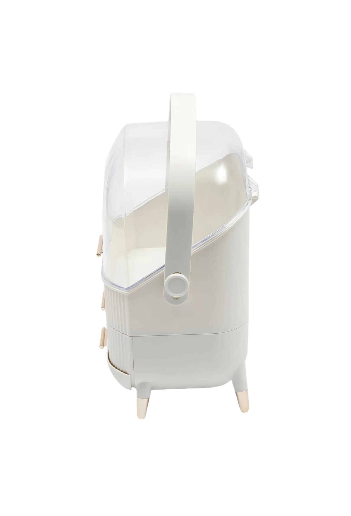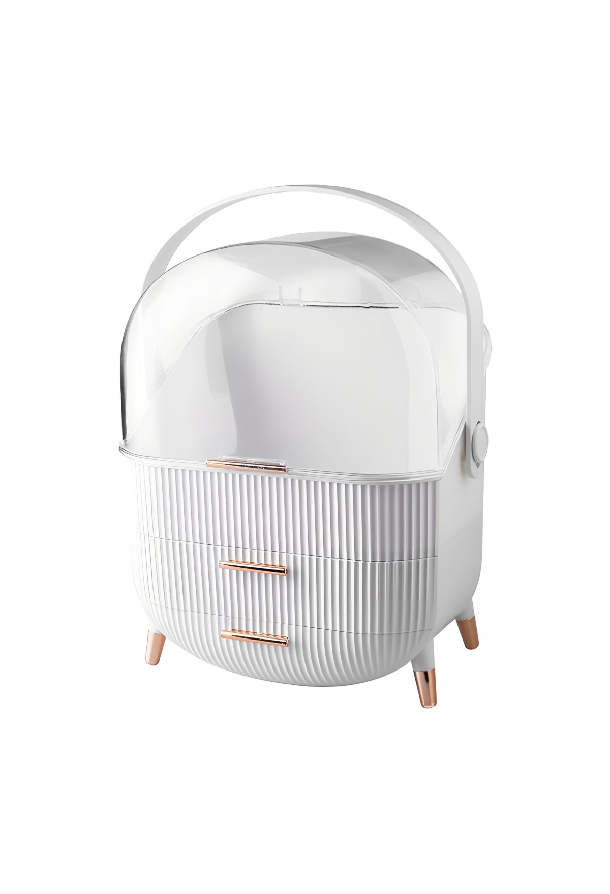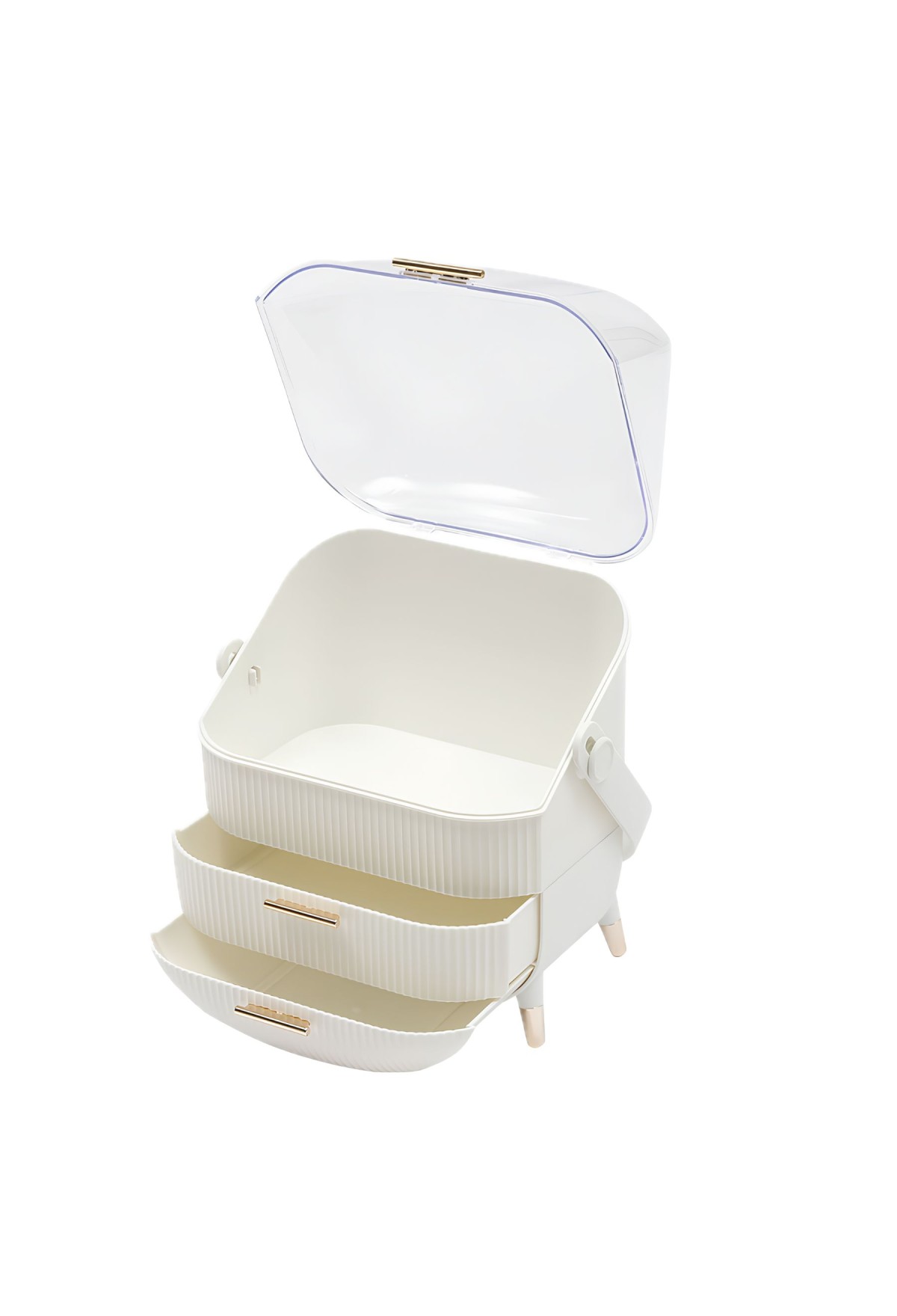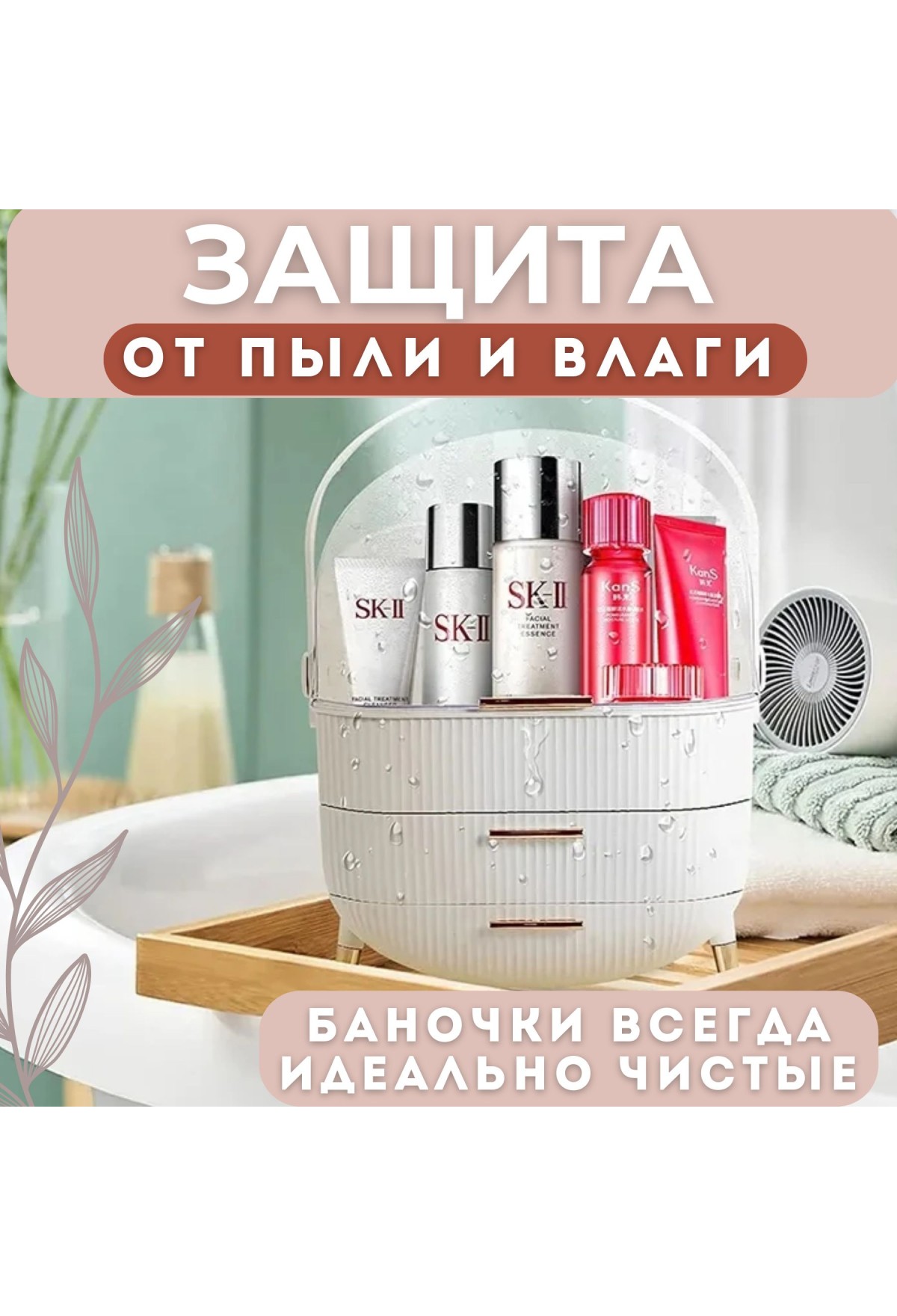 Органайзер для косметики и мелочей - находка для любой девушки и женщины. Взгляды подруг будут прикованы к нему: вместимость и изящество никого не оставляет равнодушным. Большой, но не громоздкий, органайзер идеально поместится на полке у зеркала, на тумбочке у кровати, на комоде или в ванной. Белый с лаконичными золотыми элементами - прекрасное решение для любого интерьера. А главное - вместимость и удобство использования. Органайзер пластиковый косметический имеет три отделения: верхний отсек с откидной крышкой и два выдвижных ящика. Верхний отдел можно выделить для кремов, под высокие флаконы, духи и парфюмерию. Откидной купол прозрачный, у вас всегда в обзоре нужные принадлежности. В среднем и нижнем ящичке удобно хранить уходовую косметику: палетки, карандаши, помады, маленькие бутылочки, канцелярию, маникюрные инструменты мастера, кисти для макияжа, резинки и заколки. Можно использовать для хранения украшений, бижутерии и аксессуаров, набора для маникюра, кисточек, для ватных ушных палочек и ватных дисков, подходит для визажиста. Контейнер для косметики закрытый пыле и влагонепроницаемый, что избавляет от частого ухода за косметикой, а также позволяет хранить в ванной комнате. Если вы давно в поисках коробки, тары или подставки для косметики - наш универсальный бьюти-бокс отлично справится с задачей. Наш кейс для косметики - это не только красивая организация пространства, а нечто большее. Разгрузите ящик комодика, полочки или тумбочки, освободите место на столе, переместив все в красивый бьюти - бокс. Контейнер для мелочей с прозрачной крышкой - не только экономия места, но и эстетичная изюминка интерьера. Первое, что будут спрашивать все - где взять такой же. Органайзер для косметики прозрачный настольный с выдвижными ящиками - идеальный подарок на 8 марта женщине, маме, подруге, коллеге, учителю, девочке подростку, любимой, девушке, воспитателю, дочке, сестре, жене, бабушке. На день рождения, юбилей, годовщину. Ни одна женщина не останется равнодушной.
