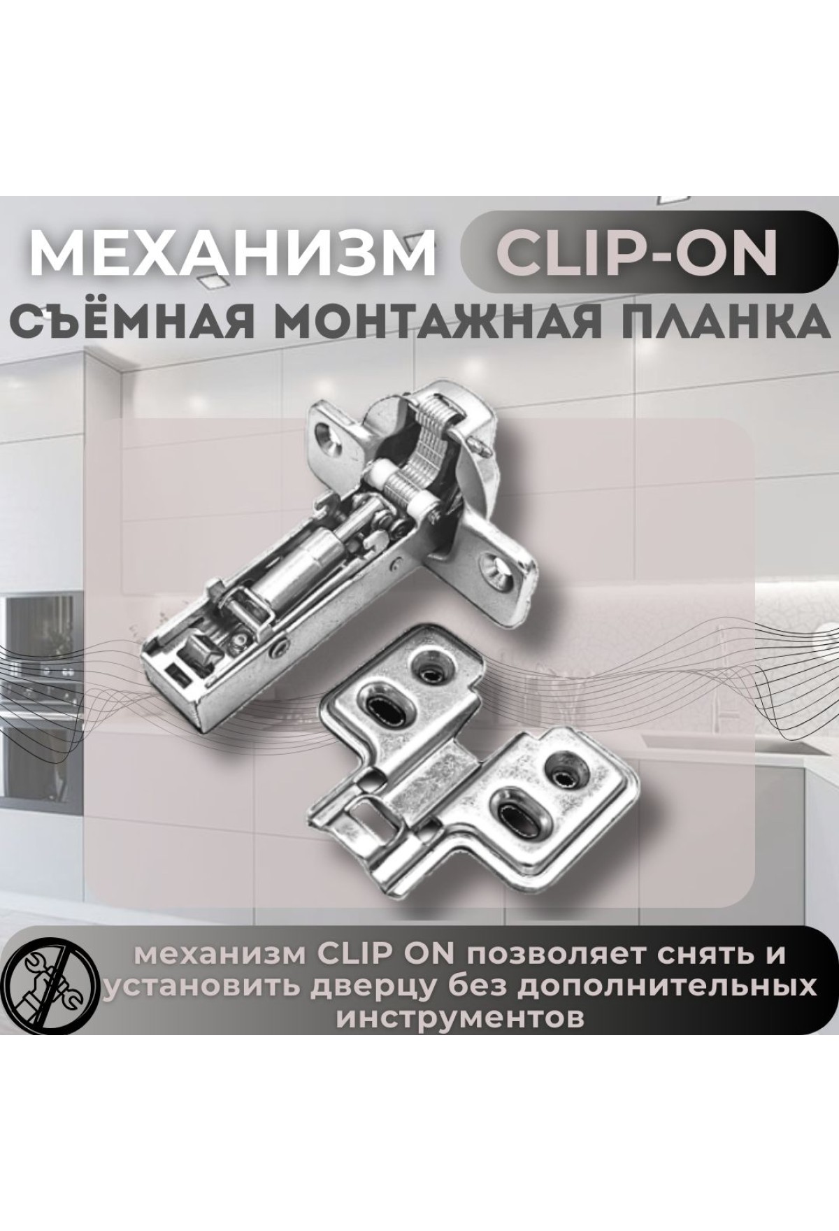 Монтаж, комплектация укомплектована ответной (монтажной) цельнометаллической планкой, изготовленной из никелированной стали. Петли относятся к системе крепления Clip-on – «быстрый монтаж». Простая и функциональная система Clip-on предполагает крепление фасада с петлями к боковине шкафа простым нажатием — петля легко и надежно защелкивается на планку.