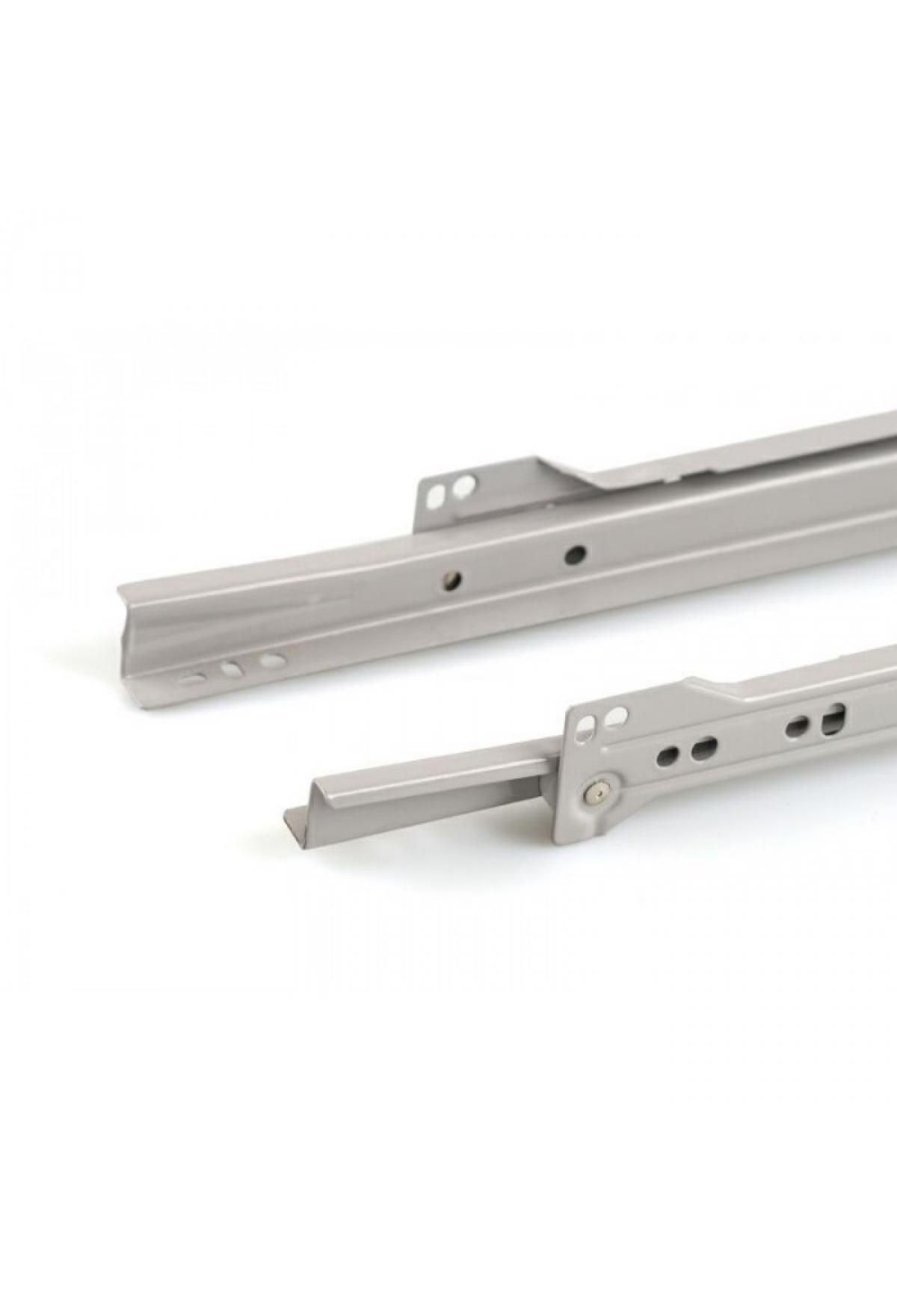 Роликовые направляющие без доводчика для выдвижных ящиков 550 мм — бюджетное и практичное решение для использования в различных шкафах и тумбах. Принцип действия основан на движении ролика одной части фурнитуры в пазе другой. Направляющие роликовые для мебельных ящиков подходят для бюджетной мебели, когда важны минимальные затраты на фурнитуру и не требуется расширенный функционал системы выдвижения. Особенности: 1) Пара выдержит нагрузку до 10 кг; 2) Обеспечивают плавное и равномерное движение ящиков без заеданий и рывков; 3) Просты в установке и подходят для самостоятельного ремонта или сборки мебели; 4) Допускают незначительные перекосы мебели; 5) Гарантируют длительный срок службы как для ящиков, так и для комода; 6) Варианты длины 250/300/350/400/450/500/550/600 мм; 7) В случае поломки легко заменить на аналогичный комплект. Роликовые направляющие для выдвижных ящиков, каждая в комплекте (левая и правая), представляет собой две пластины из металла, перемещающихся относительно друг друга при помощи пластиковых роликов. Для позиционирования в открытом состоянии мебельные направляющие имеют два останова и фиксатор от выкатывания, без амортизации. Крепится шурупами по подготовленной перфорации, которая позволяет регулировать позицию выдвижного элемента по высоте и глубине. Конструкция быстро разбирается. Следует максимально выдвинуть ящик и немного подвесить его заднюю часть. Ролик легко выскочит из желобка. Собрать рельсы мебельные также просто — надо выставить ролик в желобок.