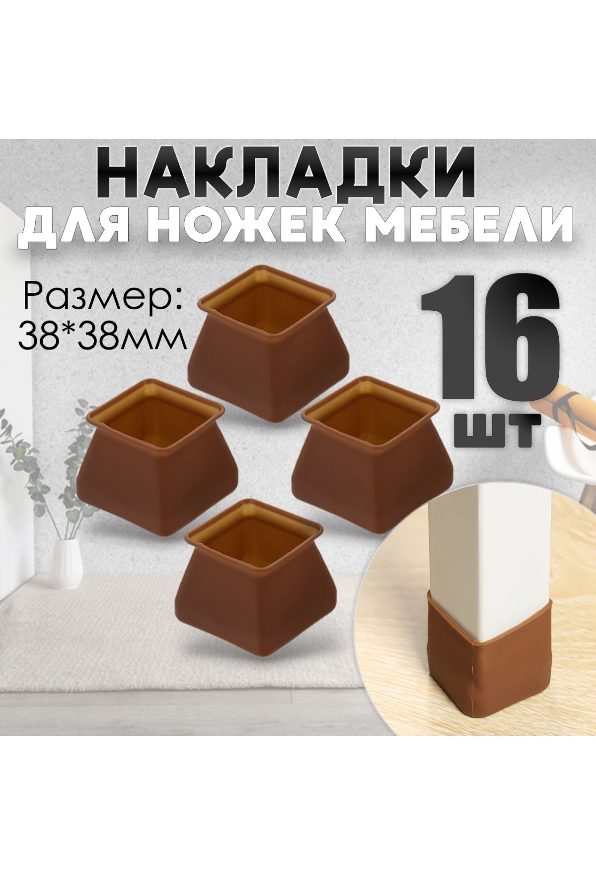 Защитные накладки, протекторы, чехлы силиконовые на ножки стола, стула, комода 40*40мм Коричневый 16шт