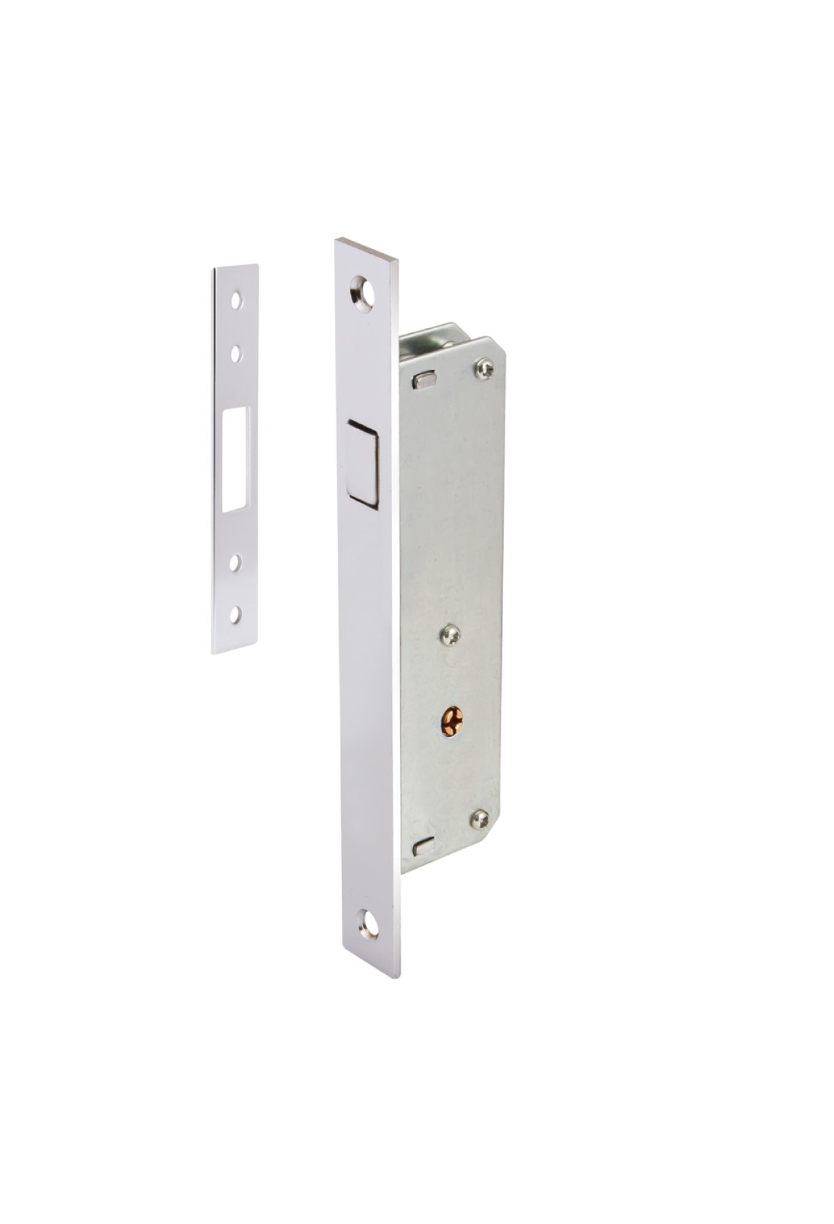 Врезной замок с выпадающим ригелем подходит как для раздвижных, так и распашных дверей. Оснащены лицевой планкой 20 мм. Бэксет - 20 мм. В комплекте 3 ключа.