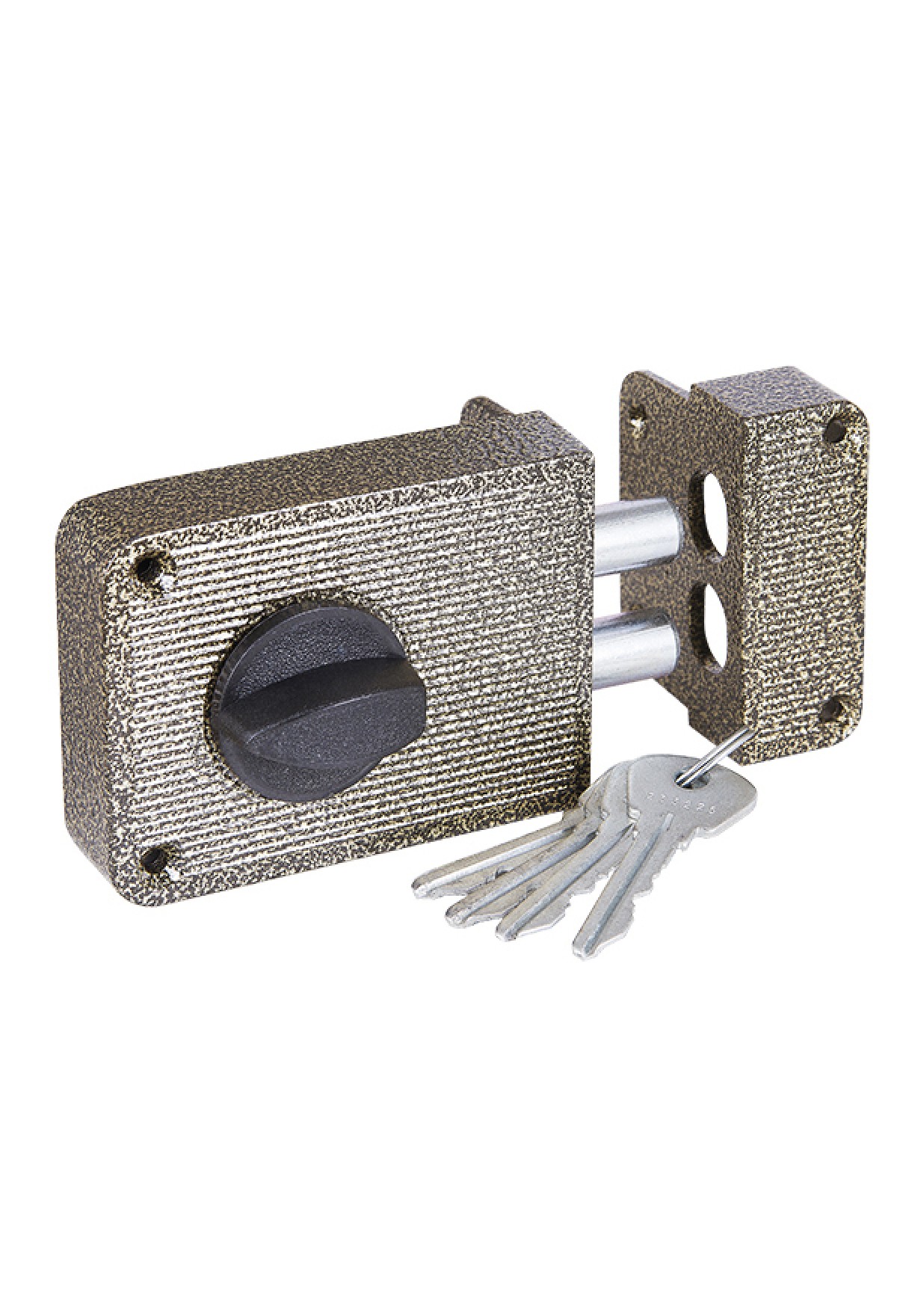 Замок накладной ЗН 1-3 предназначен для деревянных и металлических дверей. Корпус замка выполнен из цинкового сплава, ригели из стали. Имеется блокировка открывания двери ключом снаружи. Изнутри замок запирается ручкой. 2 класс секрета. Количество секретных комбинаций: 15 000. Два ригеля диаметром 14 мм. Цвет: бронза. Комплектация: замок, цилиндровый механизм МЦ-1, 4 английских ключа, ответная планка, 1 накладка, крепежная фурнитура.
